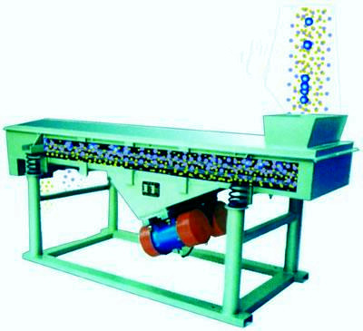 該機(jī)利用振動(dòng)電機(jī)激振作為振動(dòng)源,使物料在篩網(wǎng)上被拋起,同時(shí)向前作直線運(yùn)動(dòng),物料從給料機(jī)均勻地進(jìn)入篩分機(jī)的進(jìn)料口,通過(guò)多層篩網(wǎng)產(chǎn)生數(shù)種規(guī)格的篩上物、篩下物、分別從各自的出口排出。